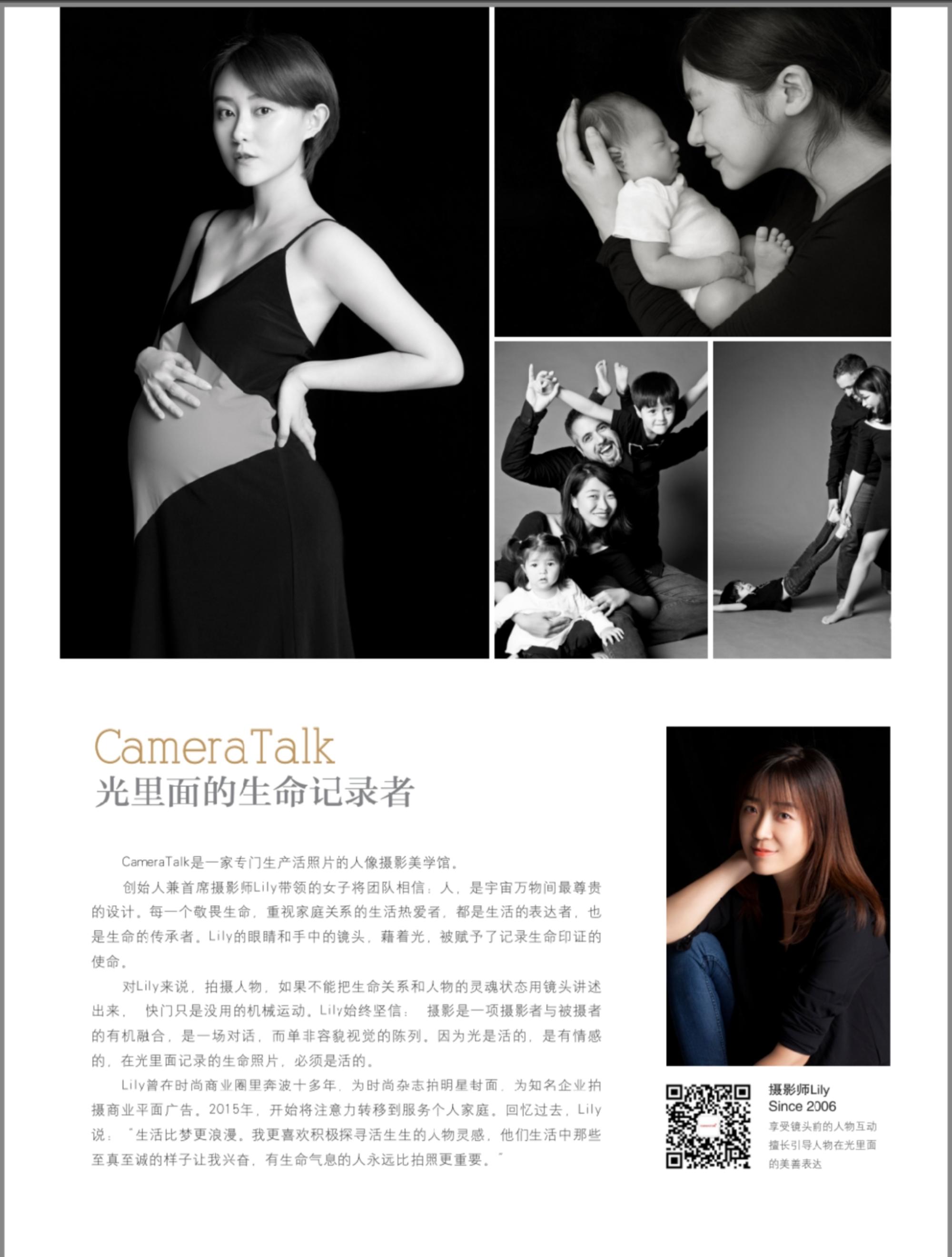 CameraTalk人像摄影由多年资深商业广告、时尚杂志 摄影师Lily主创的专业团队成立。 合作明星:张庭 谢安琪 张雨绮 戚薇 羽西 鲁豫 胡润 陈蓉等 合作杂志:《完美孕妇》《宝贝世界》《瑞丽》《ELLE》 《JESSICA》《女友》《胡润百福...